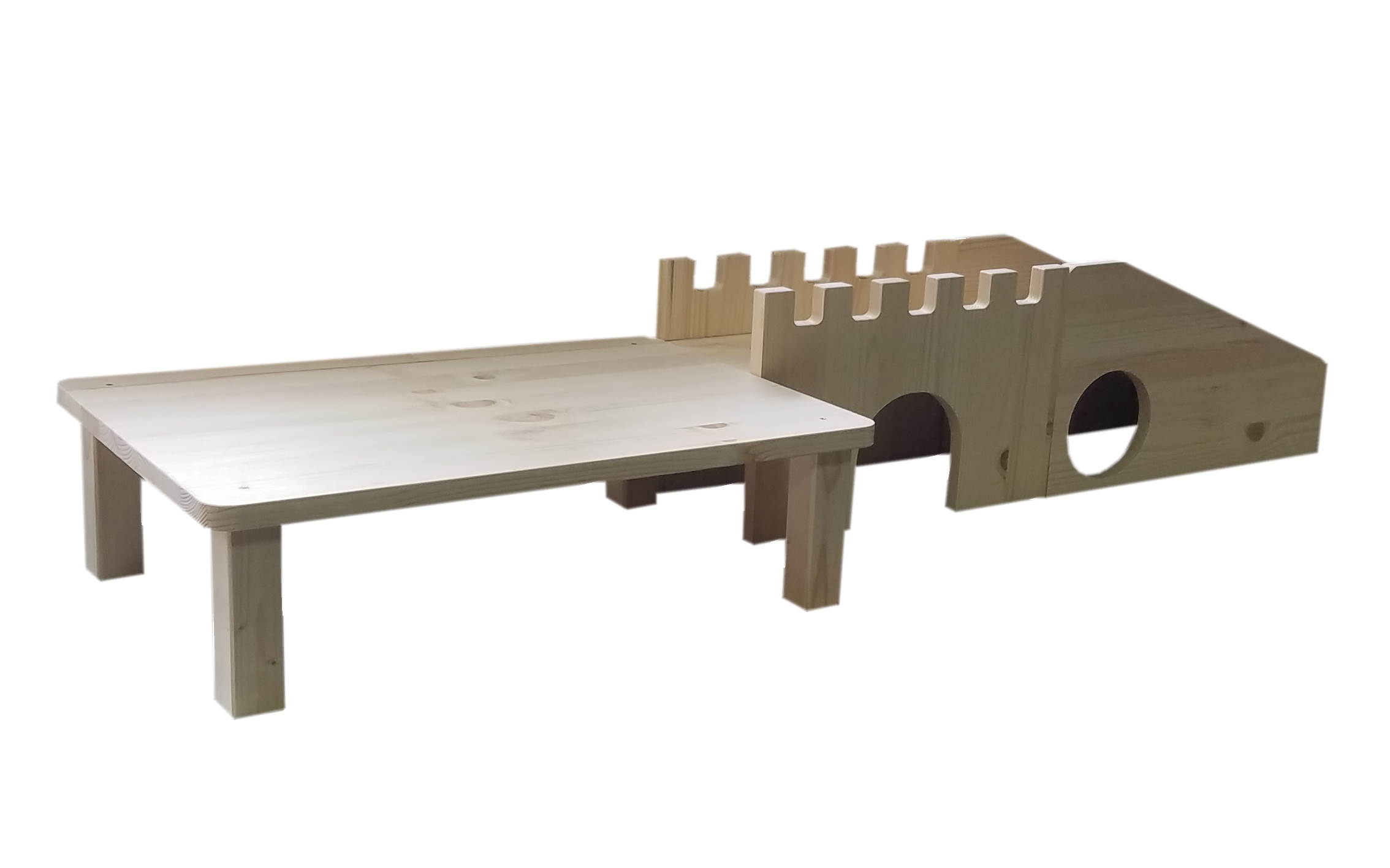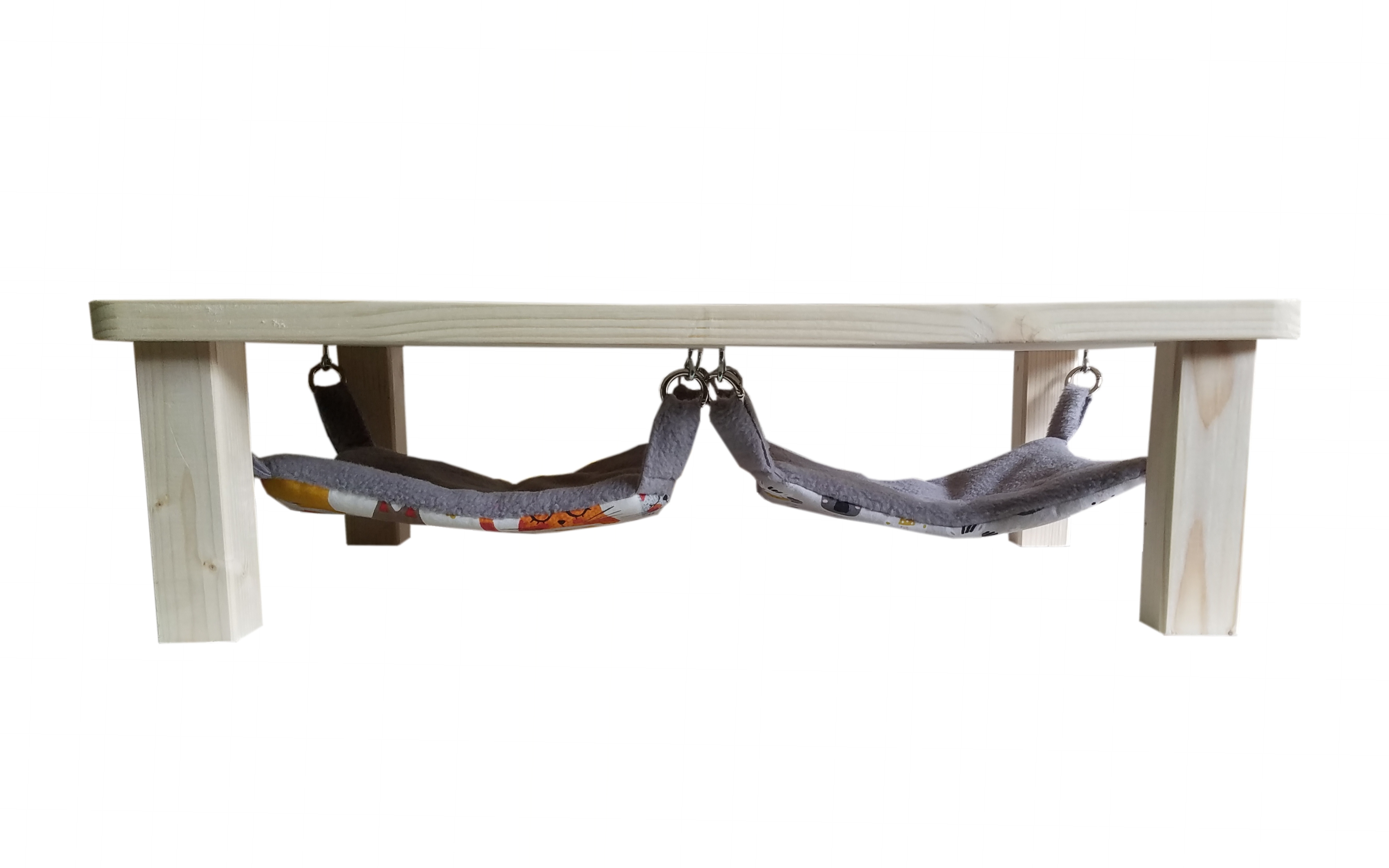 Platz für zwei chillende Meerschweinchen bietet dieses Doppelhängemattengestell aus unbehandeltem Nadelholz mit aushängesicherer Aufhängung für Hängematten. Wahlweise kann das Gestell aber auch (zum Beispiel im Sommer) als einfacher, luftiger Unterstand genutzt werden. Es wird zerlegt geliefert, die Montage geht schnell und einfach, alles benötigte Material zur Montage und zur Aufhängung von zwei Hängematten liegt bei. Die Aufhängungen bestehen wie bewährt aus Ringschrauben und Ringkarabinern, so dass es selbst die chaotischsten Schweinchen nicht schaffen die Matte auszuhängen. Die Höhe des Hängemattengestells ist an die Höhe unserer Burglaufflächen angepasst, so dass die Schweinchen vom Turm, dem Wehrgang usw. ohne Höhenunterschied auch über das Hängemattengestell laufen können. Das Doppelhängemattengestell passt größenmäßig auch direkt neben das Hängemattengestell für eine Hängematte (Art.Nr. 80108), so dass jede denkbare Anzahl von Fellnasen ihre eigene Hängematte bekommen kann. Gefertigt aus unbehandeltem Nadelholz und in Deutschland.