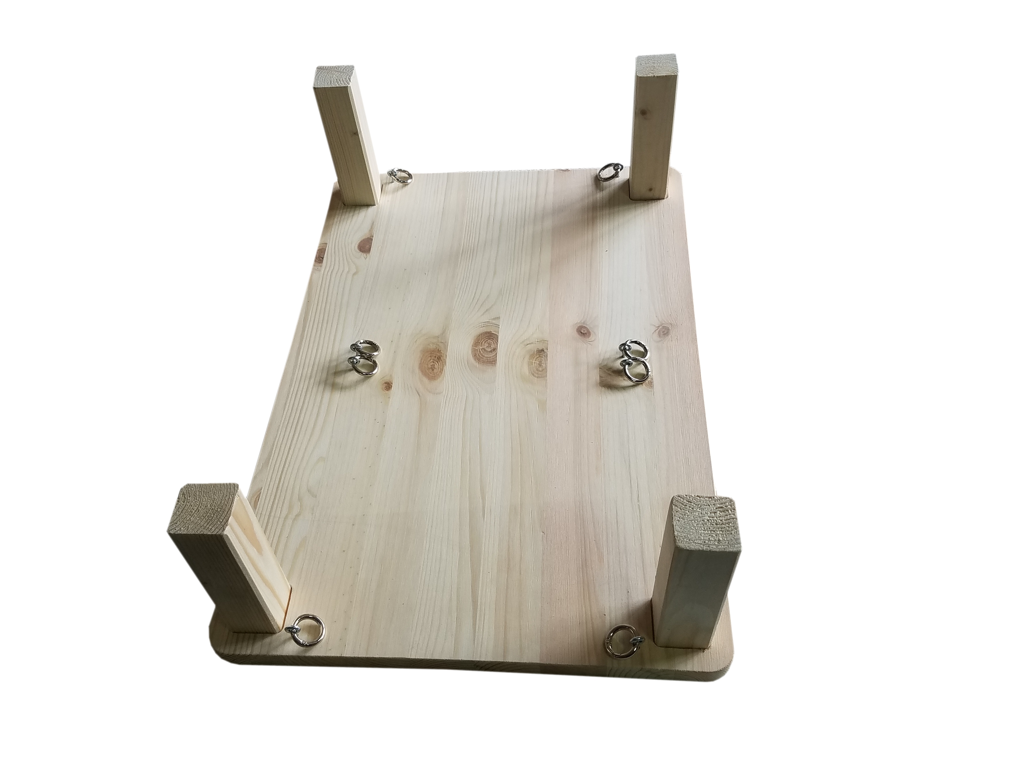 Hängemattengestell aus unbehandeltem Nadelholz mit aushängesicherer Aufhängung für Meerschweinchenhängematten. Das Gestell bietet Platz zum Aufhängen für eine Hängematte, kann aber auch als einfacher, luftiger Unterstand genutzt werden. Es wird zerlegt geliefert, die Montage geht schnell und einfach, alles benötigte Material zur Montage und zur Aufhängung einer Hängematte liegt bei. Die Aufhängungen bestehen wie bewährt aus Ringschrauben und Ringkarabinern, so dass es selbst die chaotischsten Schweinchen nicht schaffen die Matte auszuhängen. Die Höhe des Hängemattengestells ist an die Höhe unserer Burglaufflächen angepasst, so dass die Schweinchen vom Turm, dem Wehrgang usw. ohne Höhenunterschied auch über das Hängemattengestell laufen können. Das Hängemattengestell passt größenmäßig auch direkt neben das Doppelhängemattengestell (Art.Nr. 80109), so dass jede denkbare Anzahl von Fellnasen ihre eigene Hängematte bekommen kann. Gefertigt aus unbehandeltem Nadelholz und in Deutschland. Das Gestell wird OHNE HÄNGEMATTE geliefert, die passende Hängematte finden Sie in verschiedenen Mustern und Farben unter Art.Nr. 80068.  Bitte beachten Sie, dass die Hängematte Maxi (Art.Nr.80111) zu groß und somit NICHT für dieses Gestell geeignet ist!   Maße: ca 370x300x155mm   Lieferumfang: Ein Hängemattengestell zerlegt mit Montagematerial und Aufhängungsteilen, OHNE Hängematte, Meerschweinchen und Deko