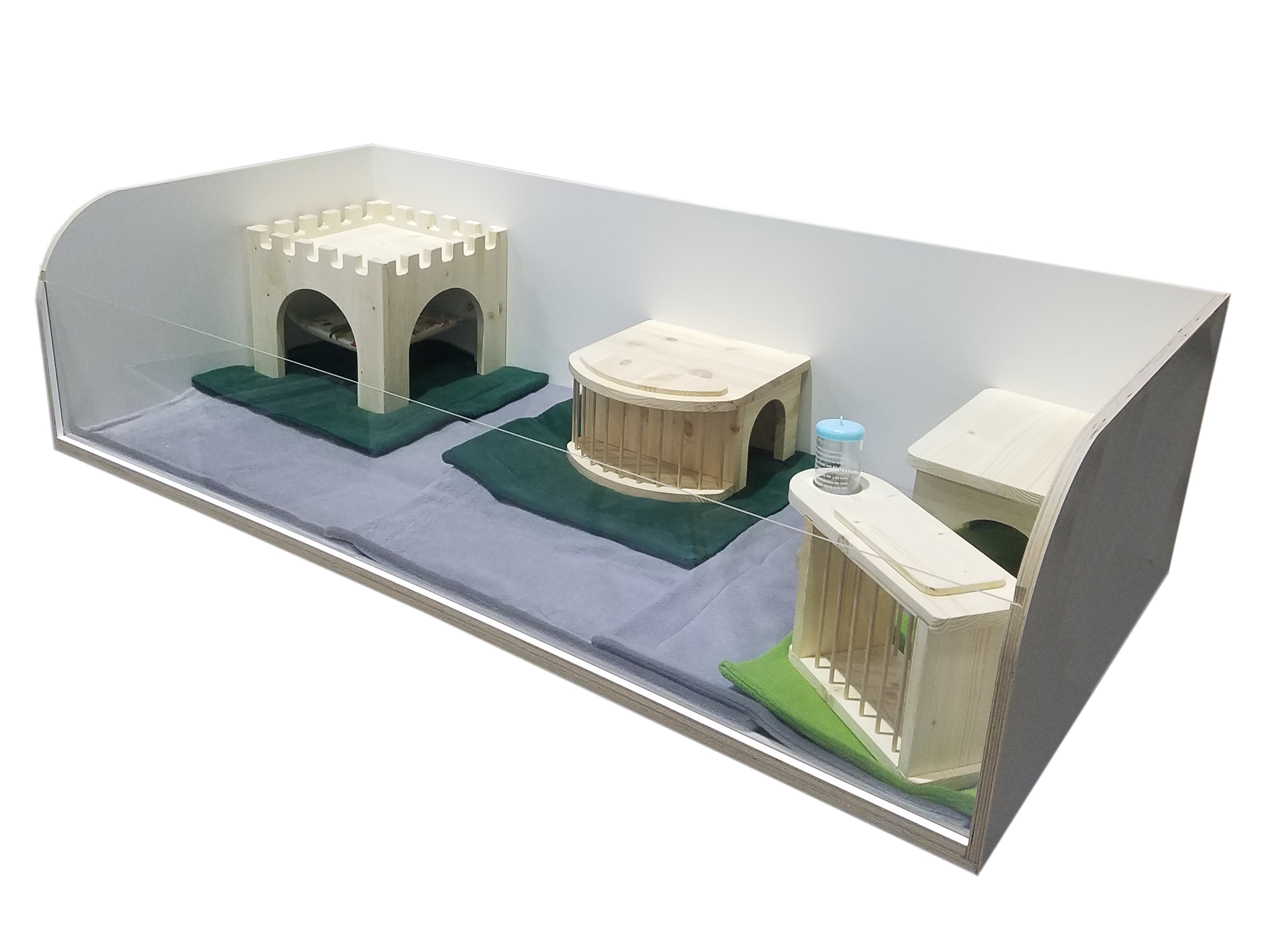 Meerschweinchengehege für die Innenhaltung. Die Acrylglasscheibe ist zur Reinigung oder für Freilauf einfach entnehmbar. Der Stall wird zerlegt geliefert und ist einfach zu montieren (benötigtes Werkzeug: Akkuschrauber mit TX10 und TX20 Bit, es muss nicht gebohrt werden). Der Zeitaufwand dafür beträgt ca. 20 Minuten.