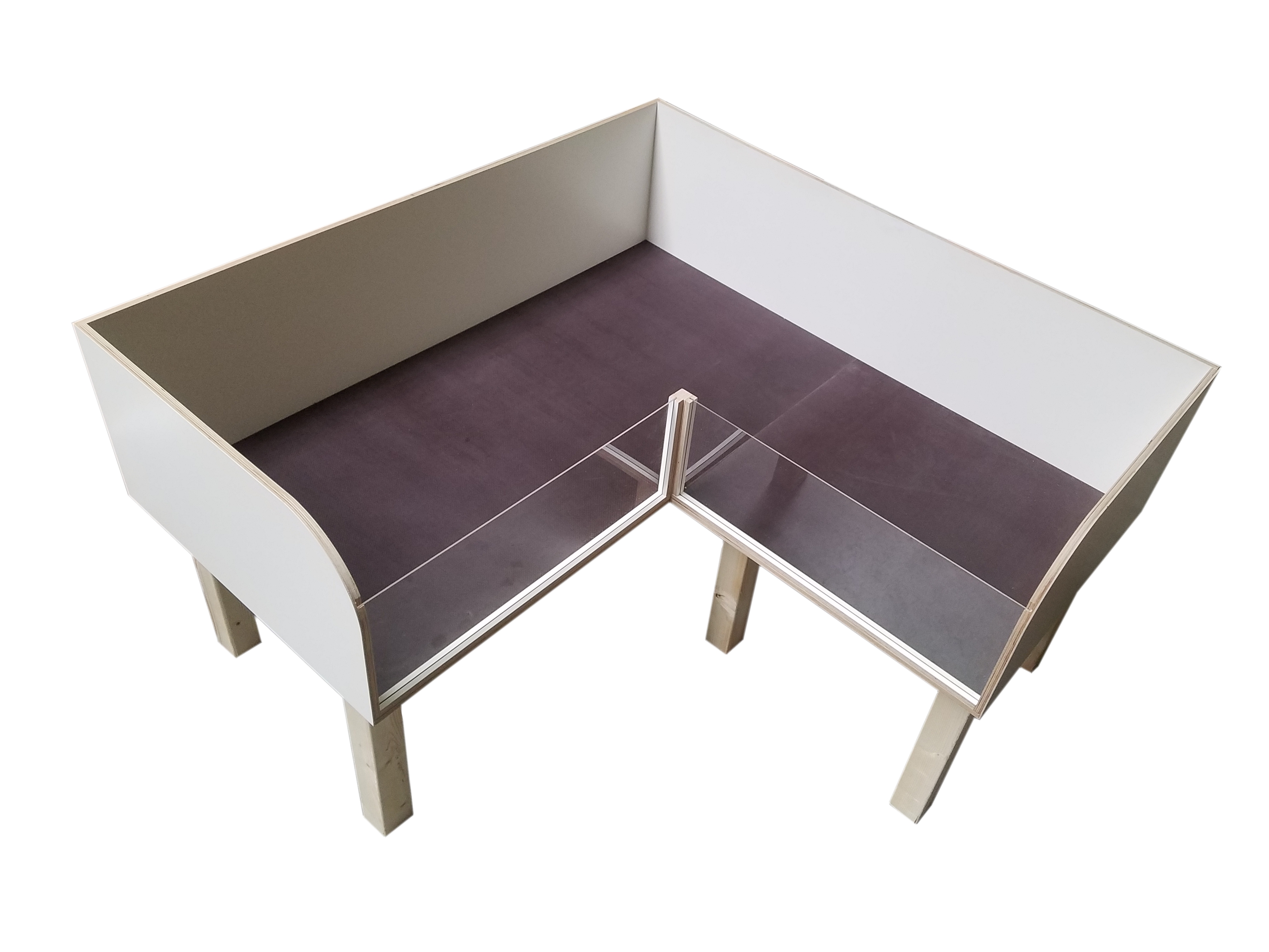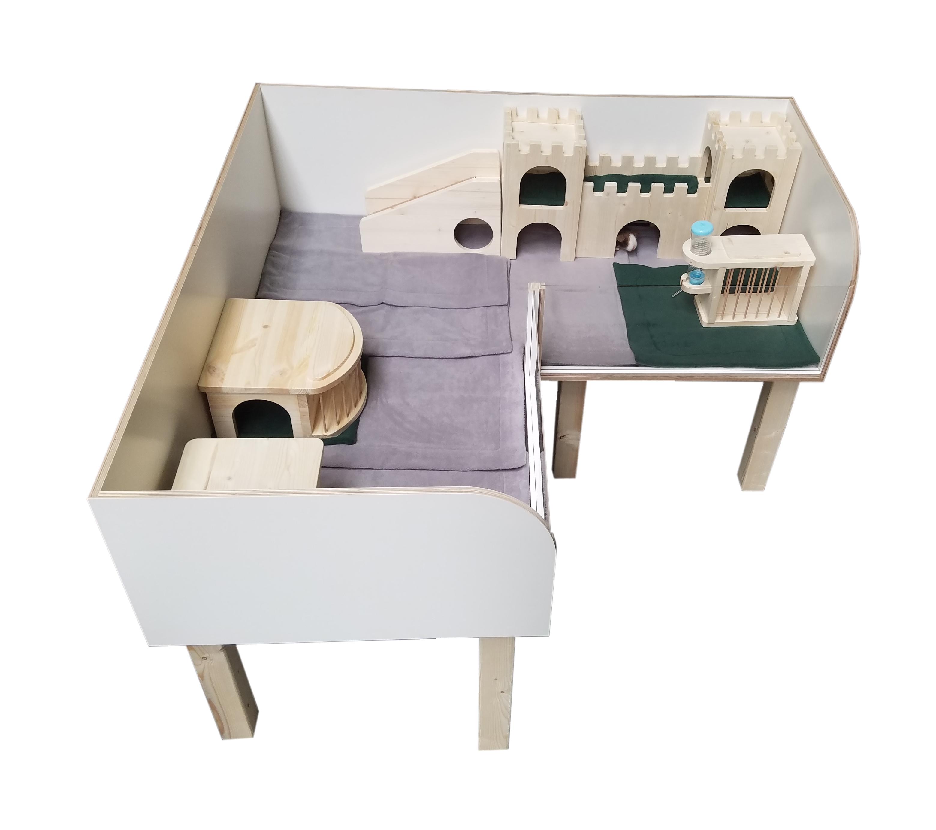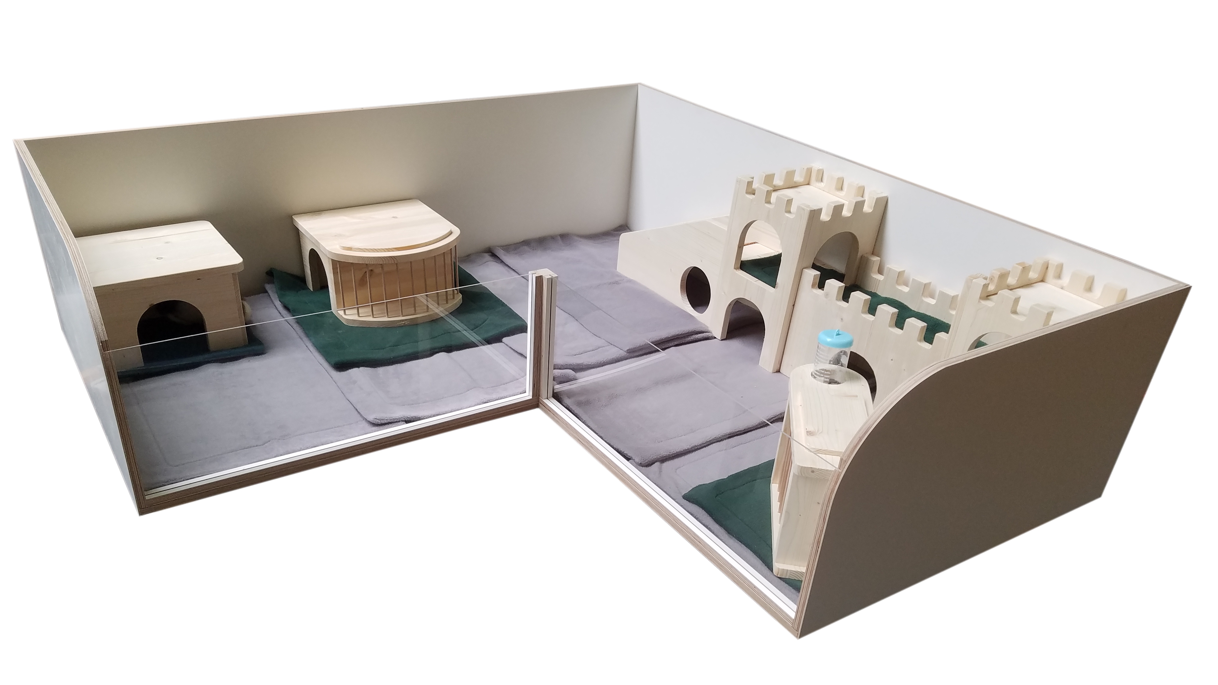 L-förmiger Meerschweinchenstall für die Innenhaltung. Die Acrylglasscheiben sind einfach entnehmbar. Der Stall wird zerlegt geliefert und ist einfach zu montieren (benötigtes Werkzeug: Akkuschrauber mit TX10 und TX20 Bit, es muss nicht gebohrt werden). Der Zeitaufwand dafür beträgt ca. 20 Minuten.