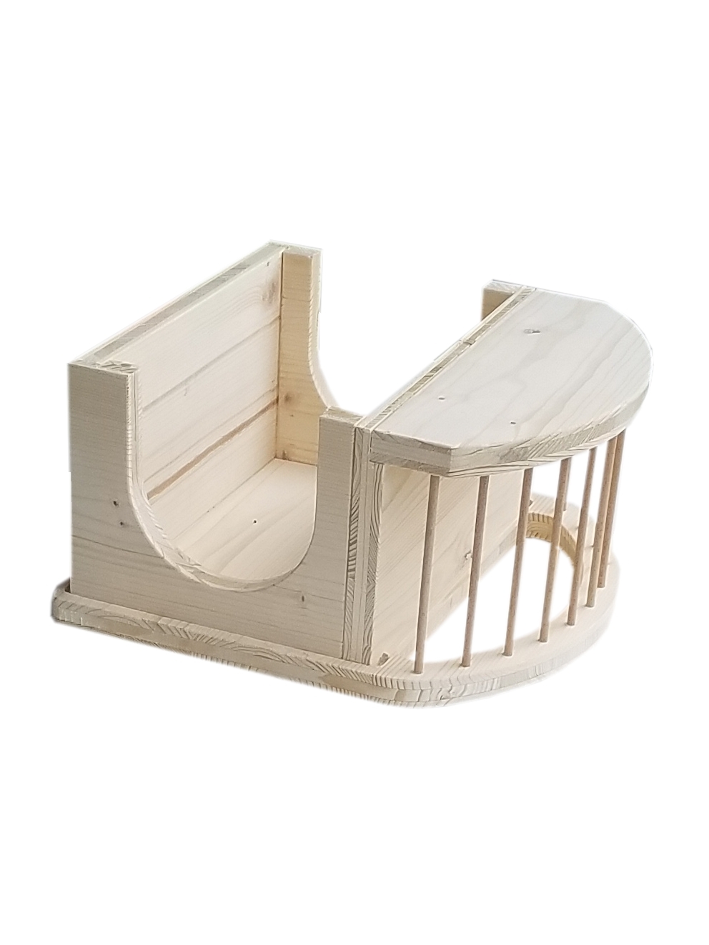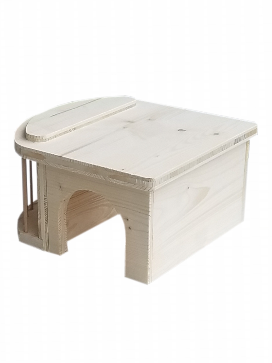 Gemütliches Meerschweinchenhäuschen mit integrierter und einfach von oben befüllbarer Heuraufe mit Deckel. Mit zwei Eingängen, abgerundeten Ecken. Aus unbehandeltem Nadelleimholz. Hergestellt in Deutschland.
