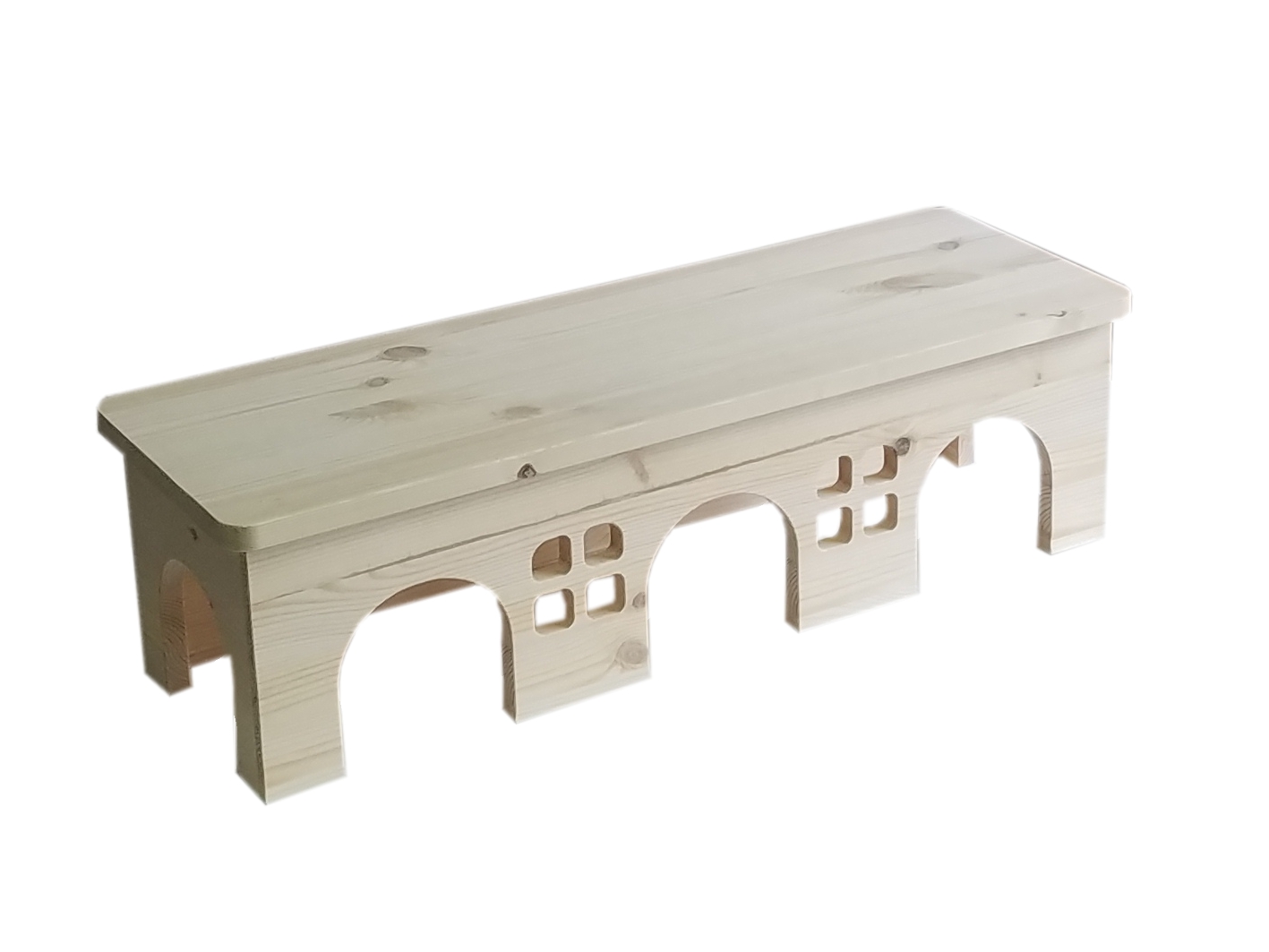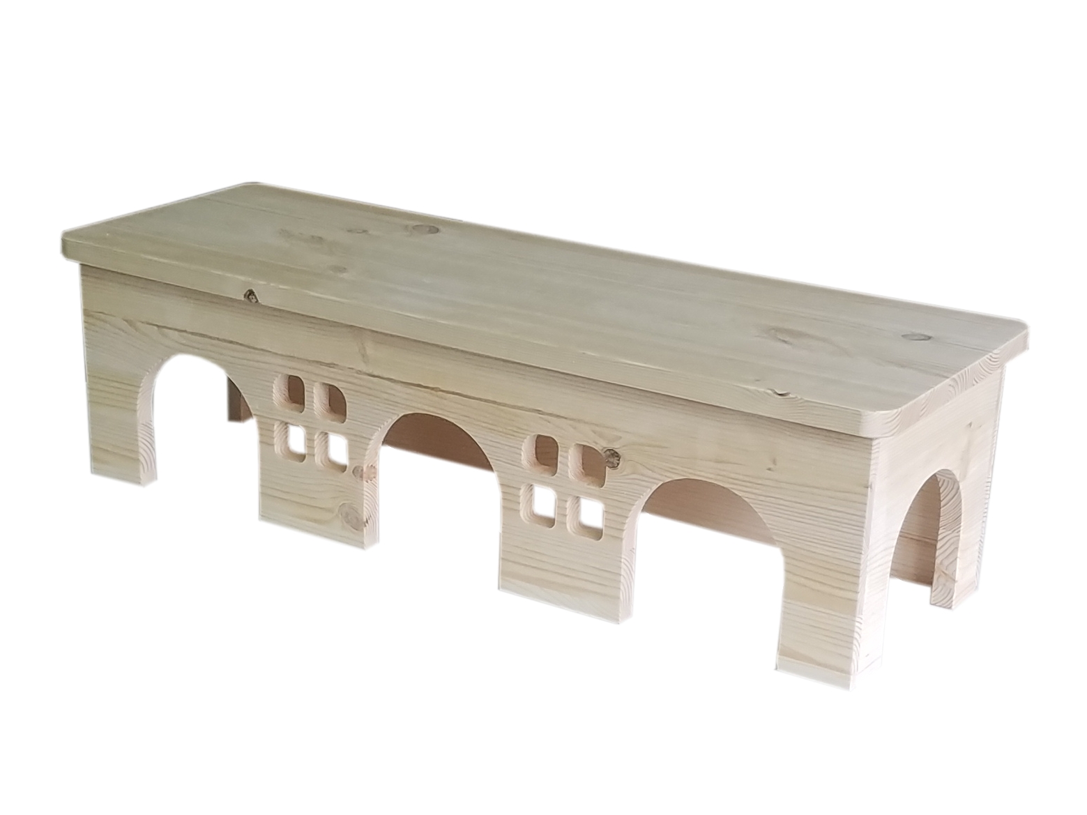 Platz für eine ganze Meerschweinchenfamilie! Sehr geräumiges Haus für Meerschweinchen mit insgesamt fünf Eingängen vorne und seitlich. So gibt es genügend Fluchtmöglichkeiten und daher ist das Haus auch für größere Schweinchengruppen geeignet. Die Rückwand ist komplett geschlossen, so dass das Haus wunderbar an die Gehegewand gestellt werden kann. Zwischen den Eingängen hat das Häuschen auf der Vorderseite 2 dekorative Sprossenfenster. Durch die vielen Öffnungen ist das Haus sehr luftig. Aus naturbelassenem Nadelholz. Hergestellt in Deutschland.