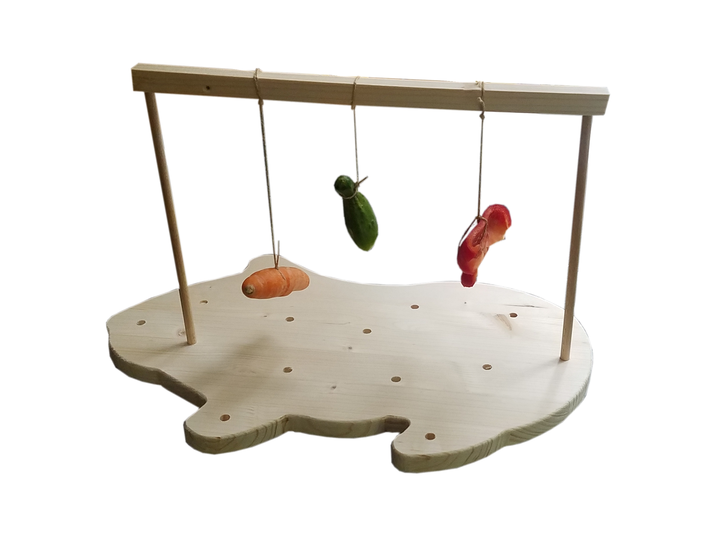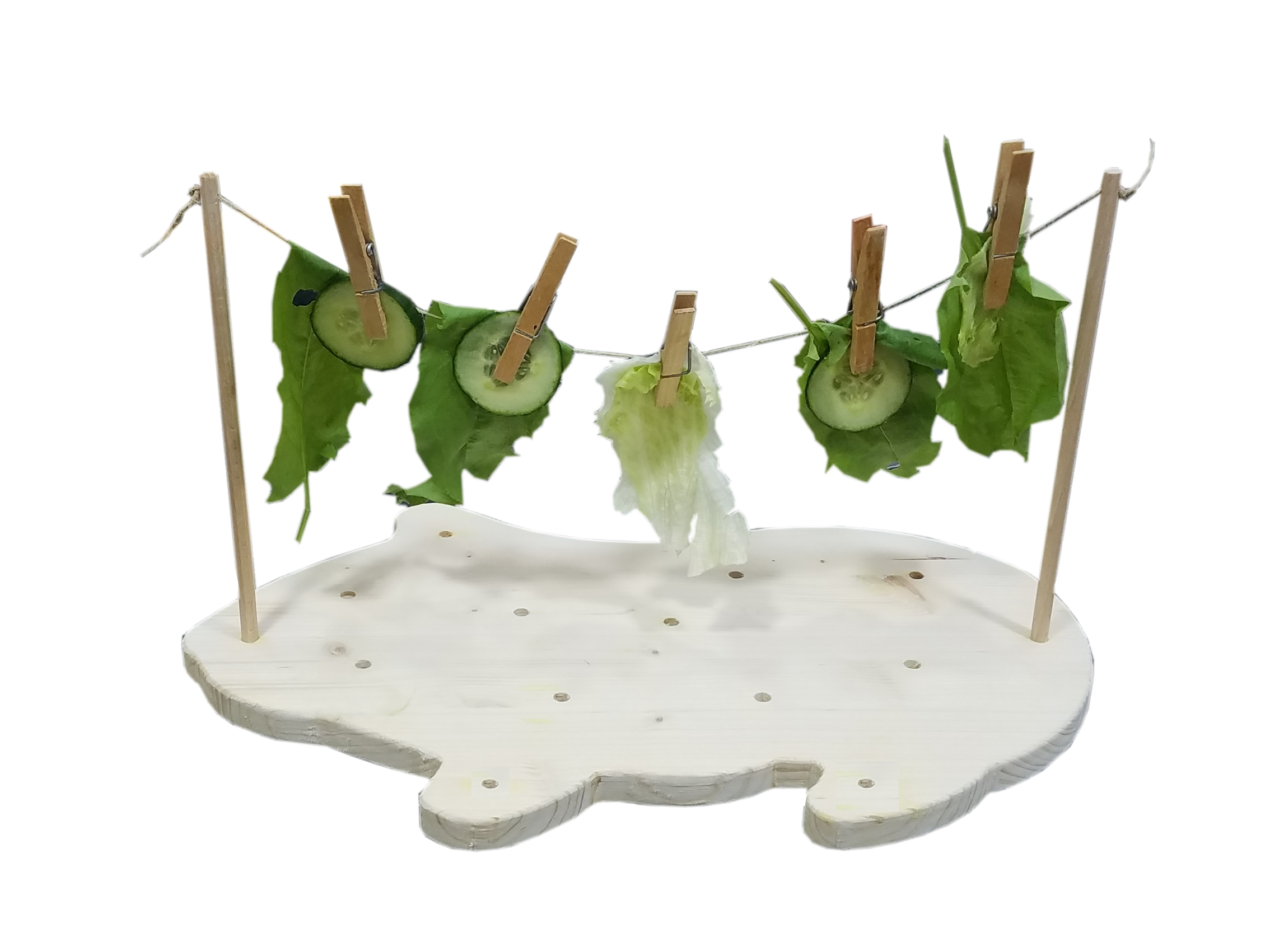 Vielseitige Beschäftigung für Meerschweinchen. Die Bodenplatte in Meerschweinchenform hat 13 Bohrungen in zwei verschiedenen Durchmessern. Diese bieten eine Vielzahl an verschiedenen Möglichkeiten. Man kann zum Beispiel Zweige in die Löcher stecken, so können die Schweinchen sich unter dem raschelnden Blätterdach verstecken und dabei an den Blättern und Zweigen knabbern. In die Vertiefungen passen aber auch Karotten - oder Selleriesticks zum Abnagen. Mit den beigelegten Rundholzstäben, der Schnur und den Wäscheklammern kann man eine Salat - und Gemüsewäscheleine machen und in Kombination mit der mitgelieferten Holzleiste entsteht ein Gemüsependel, an dem man ganze Karotten, kleine Äpfel oder ähnliches befestigen kann. Durch das Schwingen der angebundenen Sachen müssen die Meerschweinchen sehr gelenkig und flexibel sein, um an ihr Futter zu kommen. Dies fördert die geistige und körperliche Fitness. Bitte nur unter Aufsicht verwenden.