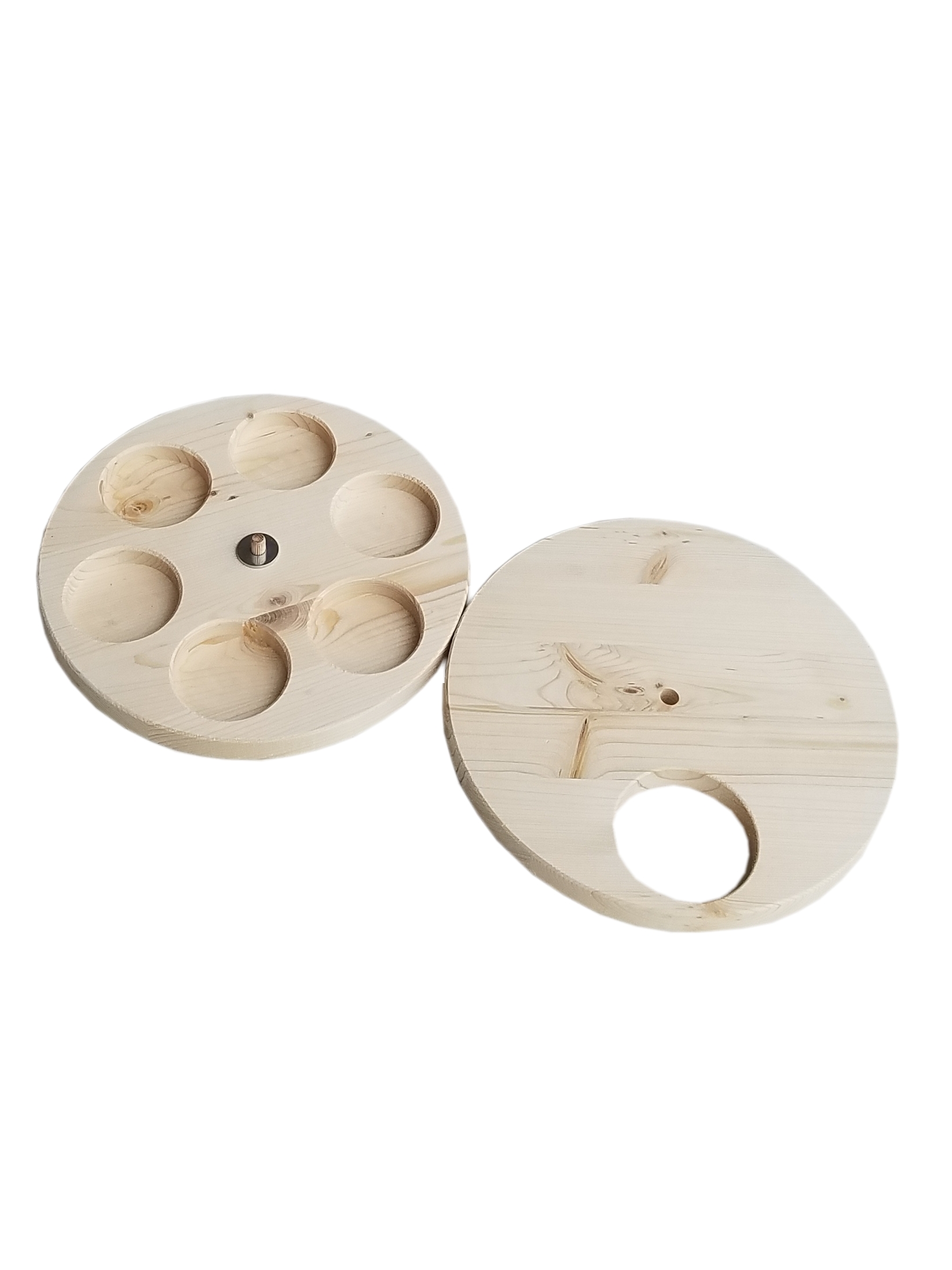 Maße: Durchmesser Drehscheiben ca 240mm, Höhe ca 40mm, Durchmesser Öffnung 70mm, Durchmesser Vertiefungen 60mm