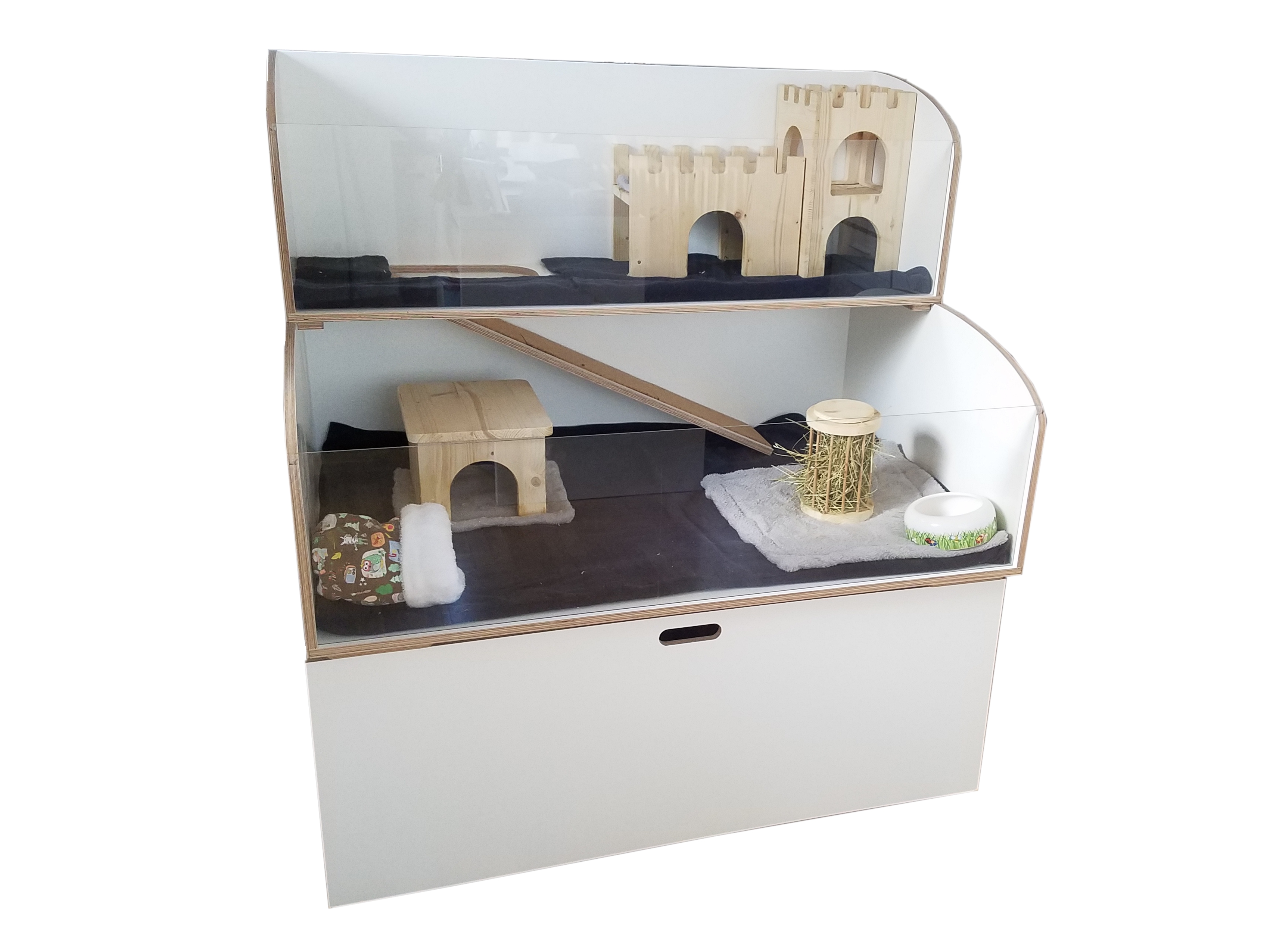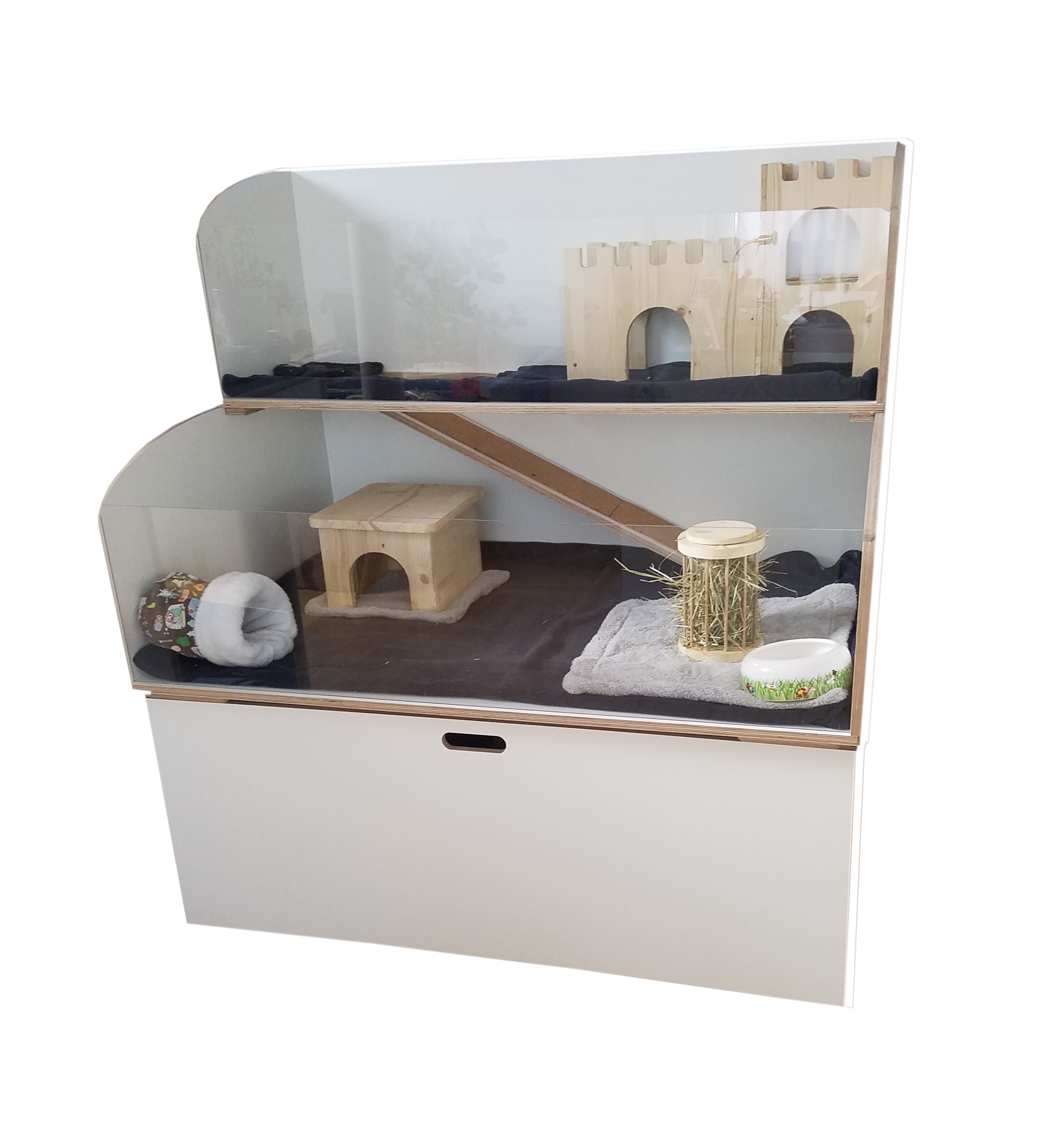 Meerschweinchengehege für die Innenhaltung. Durch die erhöhten Seitenwände kann das Gehege problemlos mit einer zweiten Ebene ergänzt werden, um die Grundfläche zu vergrößern. Die Acrylglasscheibe kann man zur Reinigung einfach nach oben entnehmen. Zu diesem Gehege passt auch der Einsatz mit Rampe (Art.Nr.80044), der Aufsatz Schweinestall (Art.Nr. 80034), außerdem die Beine für Schweinestall (Art.Nr. 80026) und die Schublade (Art.Nr. 80042). So kann das Gehege wachsenden Ansprüchen entsprechend erweitert werden. Der Stall wird zerlegt geliefert und ist einfach zu montieren (benötigtes Werkzeug: Kreuzschlitzschraubendreher), der Zeitaufwand dafür beträgt ca. 20 Minuten. WICHTIG: Meerschweinchen sind bewegungsfreudige Tiere. Für eine artgerechte Haltung ist zusätzlicher, kontrollierter Freilauf notwendig. Aus 15 mm wasserfest verleimtem Furniersperrholz mit weißer Melaminharzbeschichtung* oder mit schwarzer Phenolharzbeschichtung und 3 mm Acrylglas. Im Lieferumfang enthalten sind die benötigten Schrauben sowie 6 Gummifüßchen. Gefertigt in Deutschland. Maße: Breite ca. 1200 mm, Tiefe ca. 800 mm, Höhe ca. 600 mm, Höhe Acrylglasscheibe ca. 300 mm Lieferung zerlegt, ohne Werkzeug, Meerschweinchen und Deko. *Melaminharz wird zum Beispiel für die Beschichtung von Küchenarbeitsplatten oder zur Herstellung von bruchfestem Kindergeschirr verwendet.