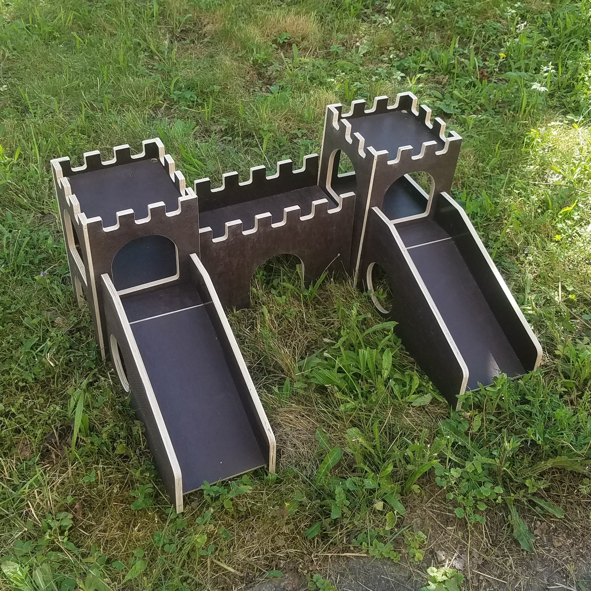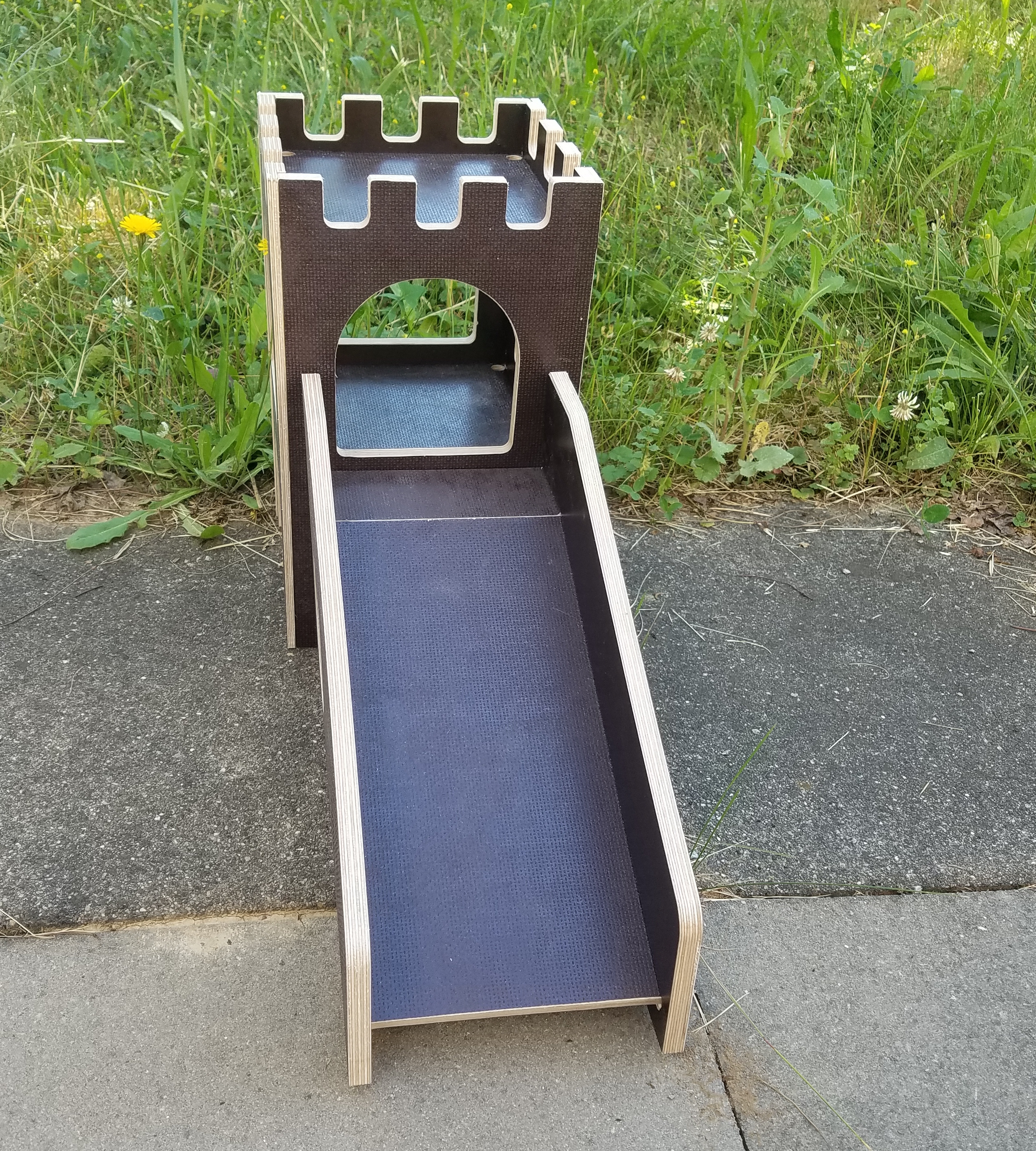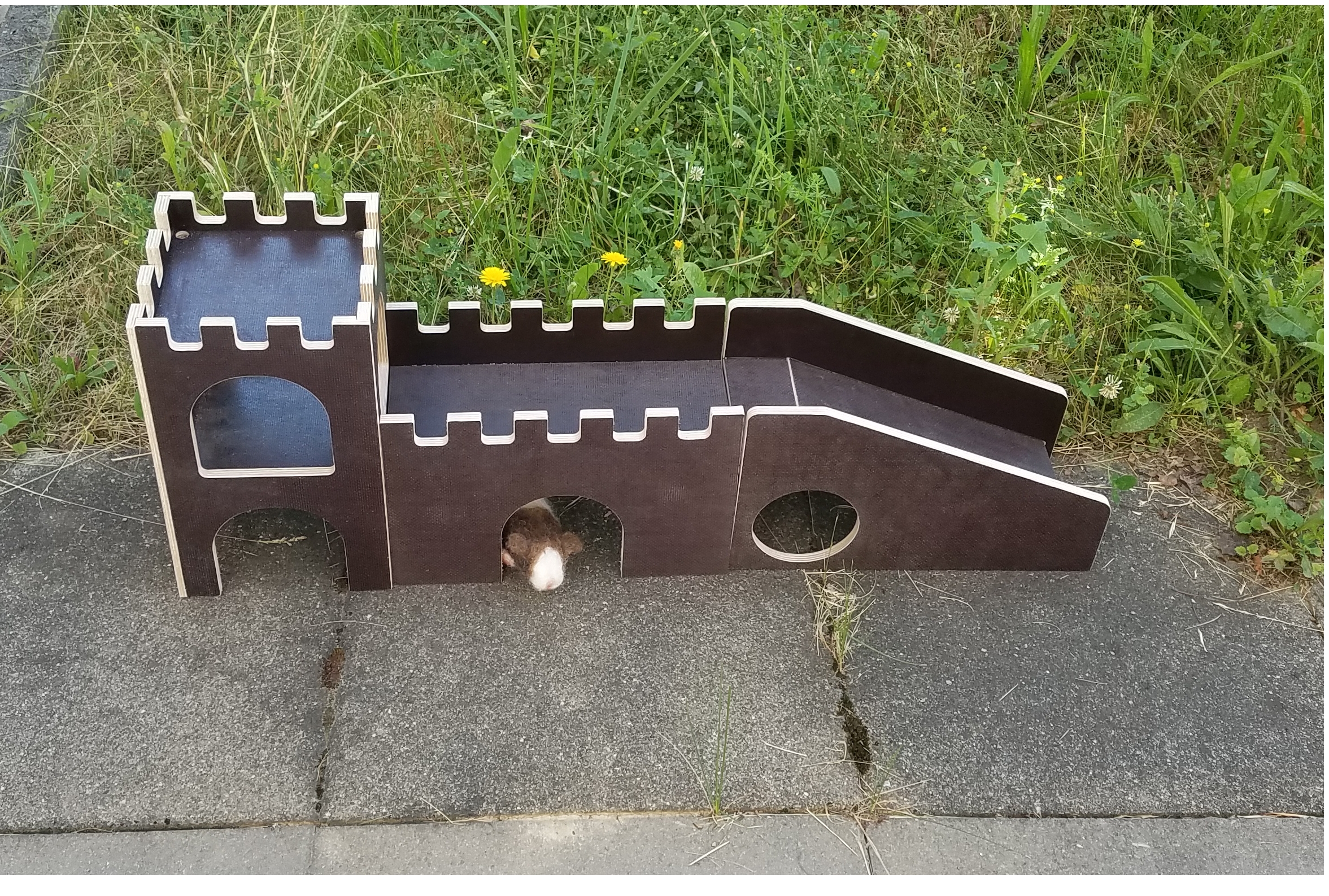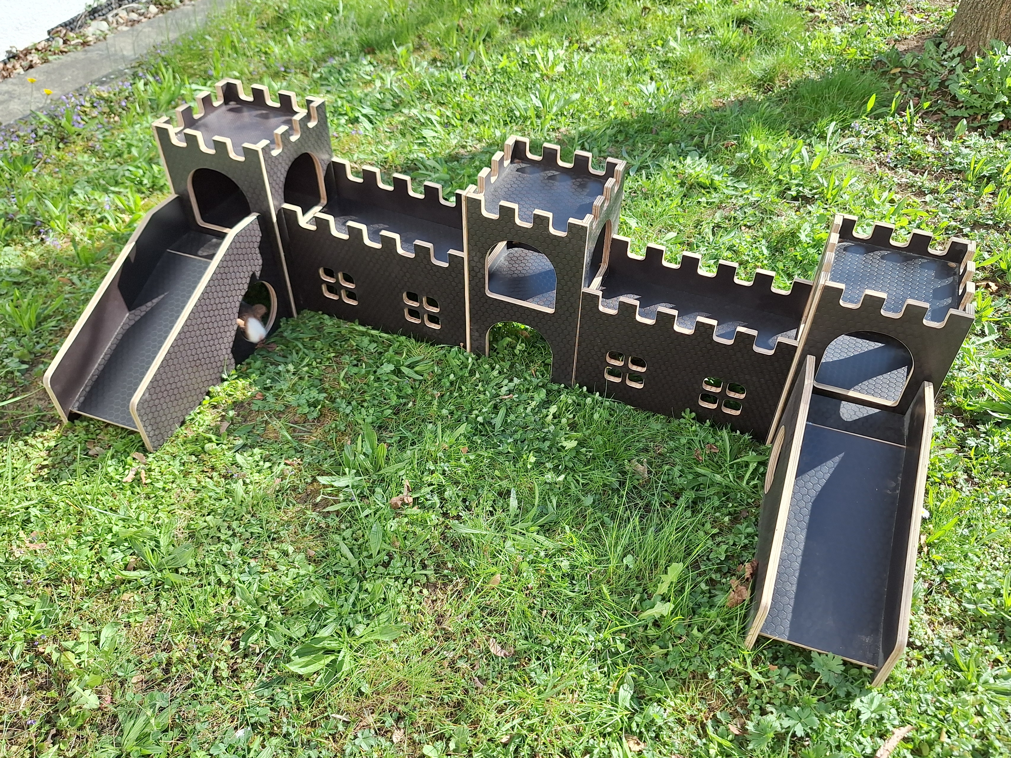 Omi Cookie hat die Burg angenommen und ist mit ihren 7 Jahren todesmutig ob runtergehüpft. Die Flauschmäuse sind mit der Qualität sehr zufrieden, nutzen die Rampe auch zum Heumümmeln. Der untere Teil wird von allen genutzt.