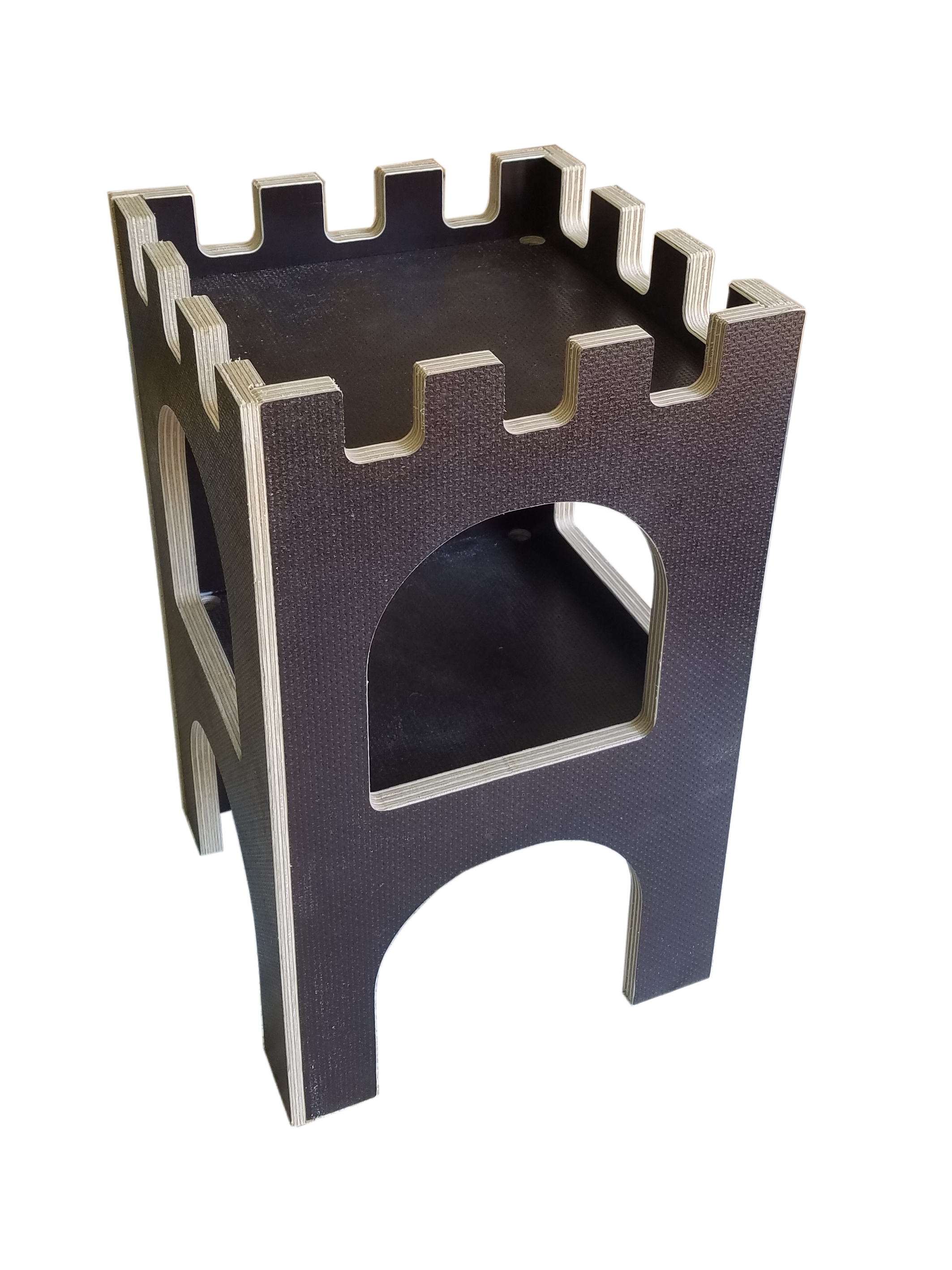 Der Turm ist wasserfest verleimt und hat in allen vier Ecken beider Ebenen Regenwasserabflüsse, damit kein Wasser stehen bleibt. Hergestellt in Deutschland aus wasserfest verleimtem Furniersperrholz. Oberflächenstruktur nach Vorrat.