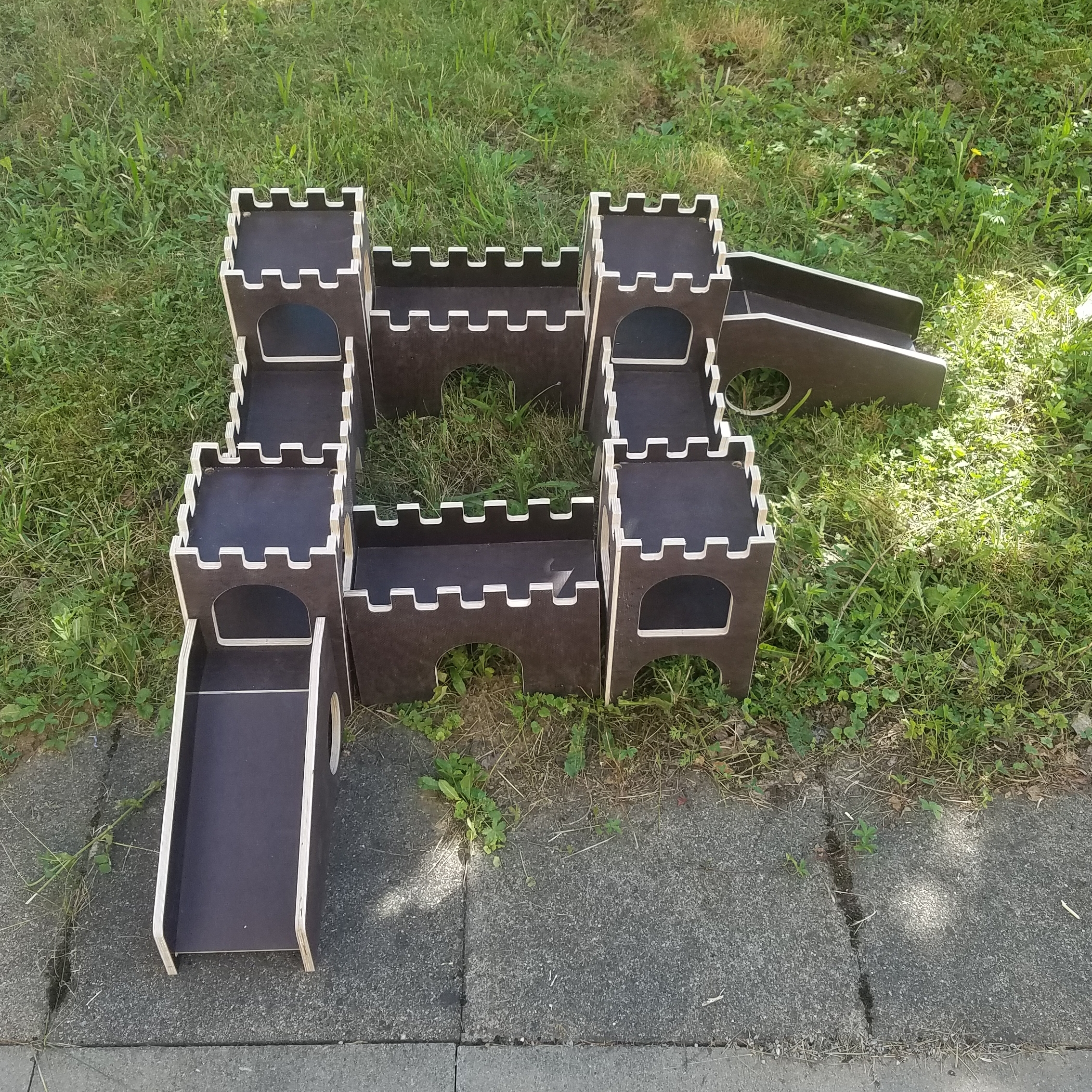Wehrgang für die Wutzenburg. Der Wehrgang hat an beiden Längsseiten einen Eingang und ist an beiden Schmalseiten offen, so dass er mit dem Wutzenburg Burgturm wetterbeständig (Art.Nr.80103), den Wehrgängen mit Fenstern (Art.Nr. 80131, 80132), dem Burgturm wetterbeständig windgeschützt (Art.Nr. 80130) und der Rampe wetterbeständig (Art.Nr.80105) kombiniert werden kann. Hergestellt aus wasserfest verleimtem Furniersperrholz und in Deutschland. Oberflächenstruktur nach Vorrat. Lieferumfang: ein Wehrgang-Element ohne Meerschweinchen und Deko Maße: ca. 350x180x230mm, Durchgänge ca. 125x125mm, die Lauffläche befindet sich in ca.155mm Höhe und passt so genau zur oberen Ebene des Burgturmes.