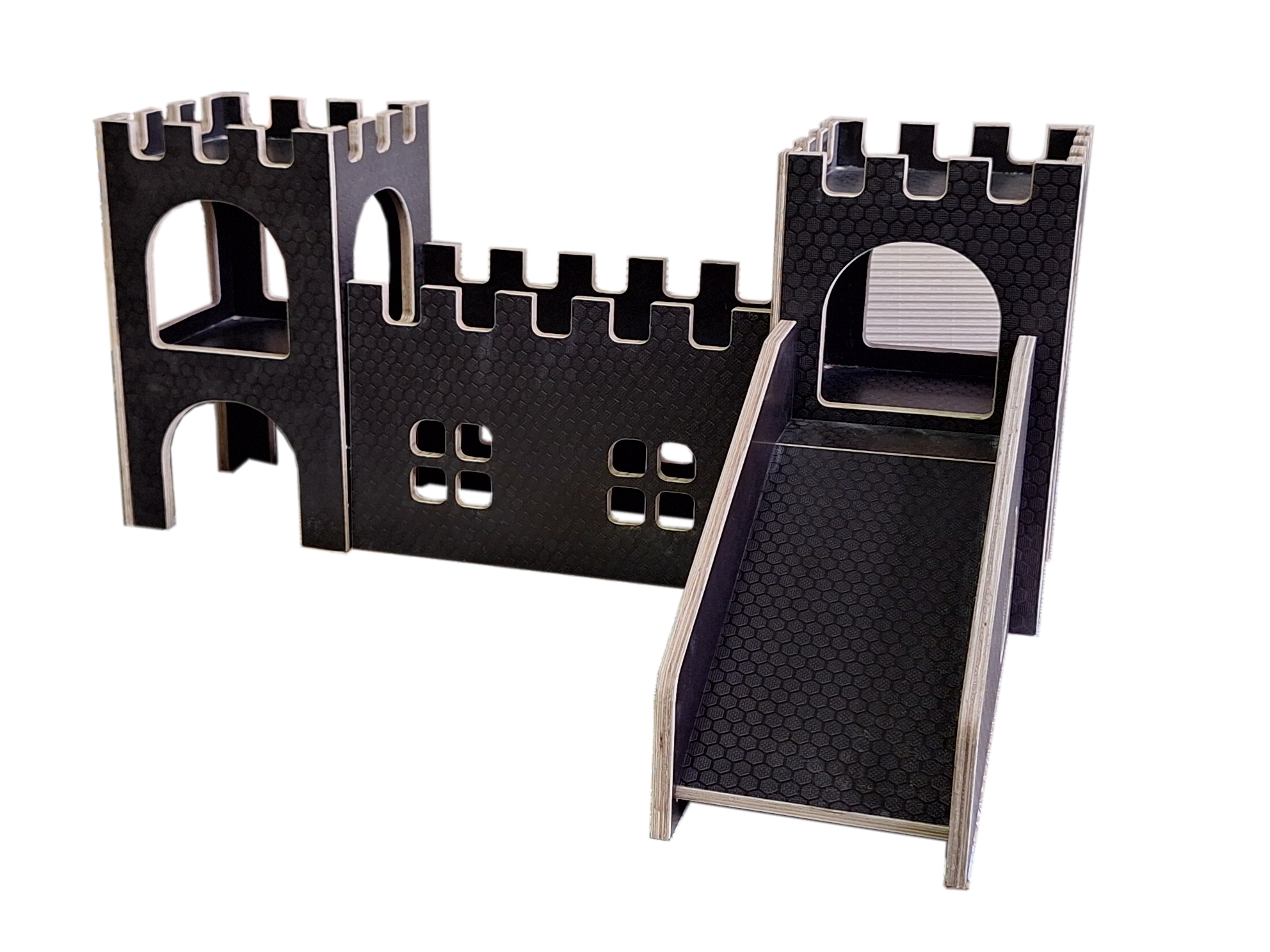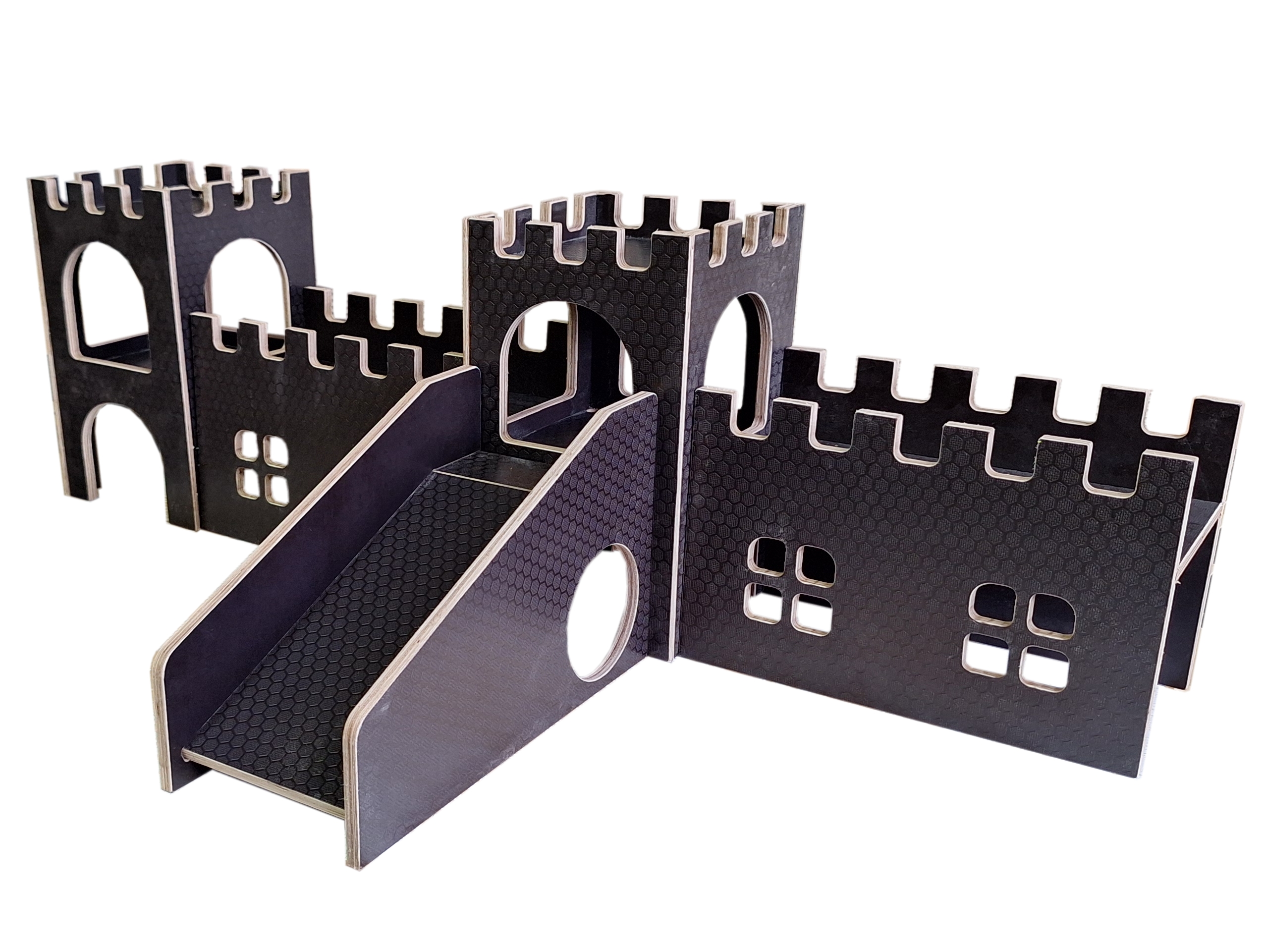 Wehrgang mit Fenstern für die wetterbeständige Wutzenburg. Der Wehrgang hat an einer Längsseite Fenster, die andere Längsseite ist komplett geschlossen. Beide Schmalseiten sind offen, so dass er mit dem Wutzenburg Burgturm wetterbeständig (Art.Nr.80103), dem Burgturm wetterbeständig windgeschützt (Art.Nr.80130), dem Wehrgang wetterbeständig (Art.Nr. 80104), dem Wehrgang mit Fenstern beidseitig wetterbeständig (Art.Nr. 80132) und der Rampe wetterbeständig (Art.Nr.80105) beliebig kombiniert werden kann. Hergestellt aus wasserfest verleimtem Furniersperrholz und in Deutschland. Oberflächenstruktur nach Vorrat. Lieferumfang: ein Wehrgang-Element ohne Meerschweinchen und Deko Maße: ca. 350x180x230mm, die Lauffläche befindet sich in ca.155mm Höhe und passt so genau zur oberen Ebene des Burgturmes.