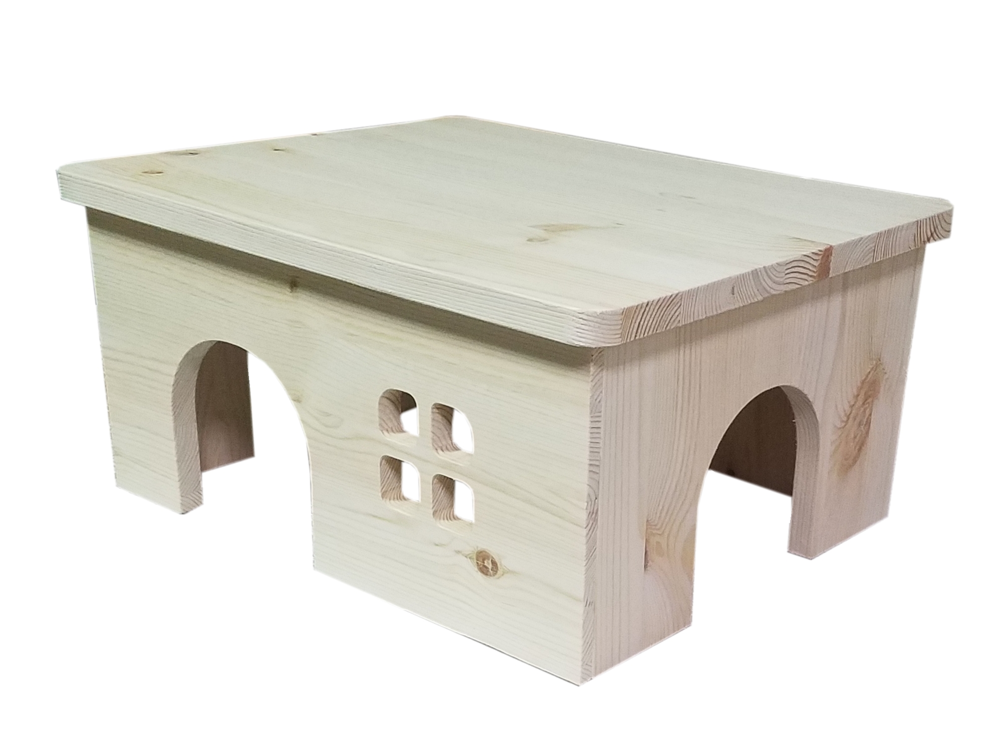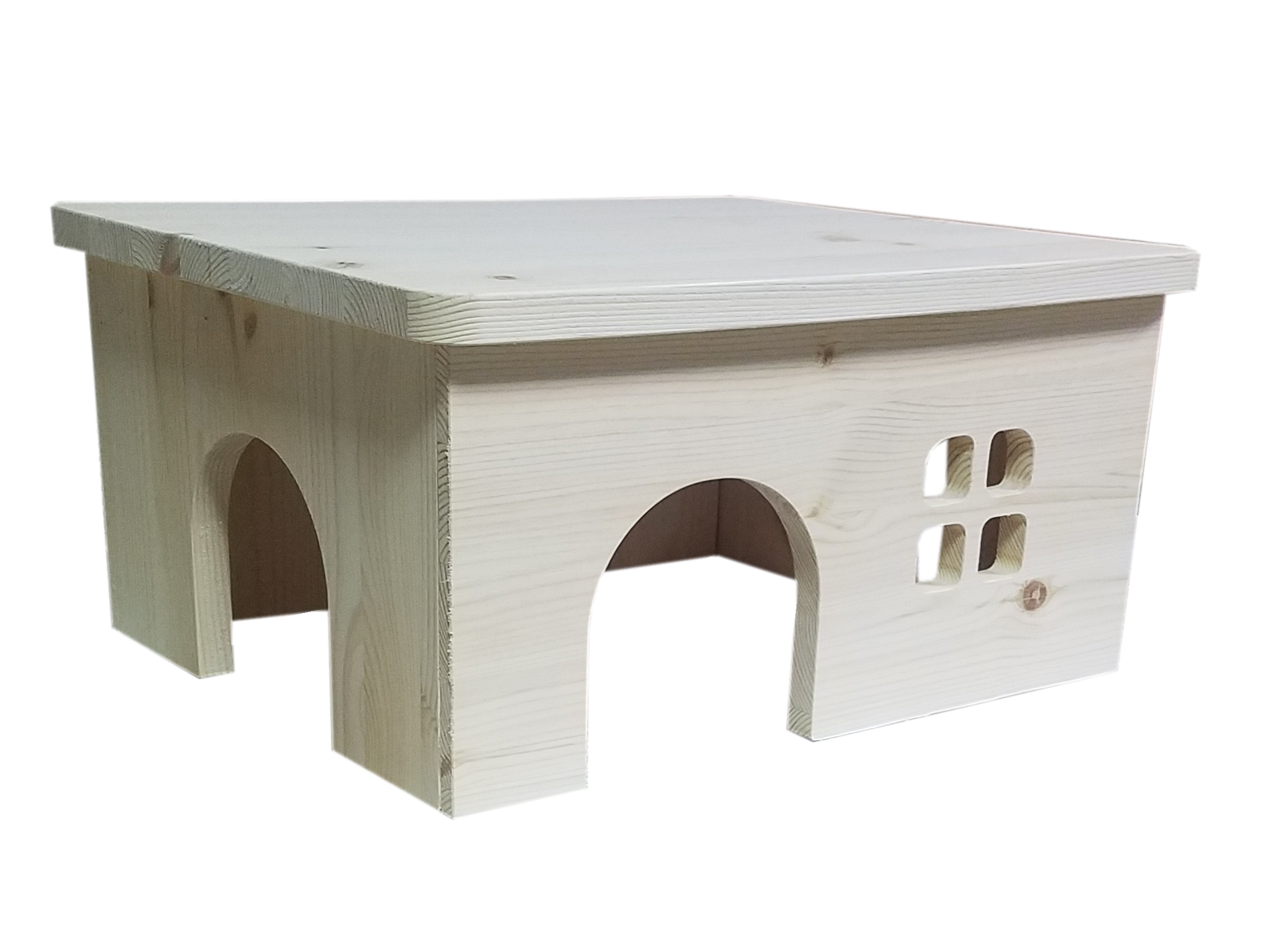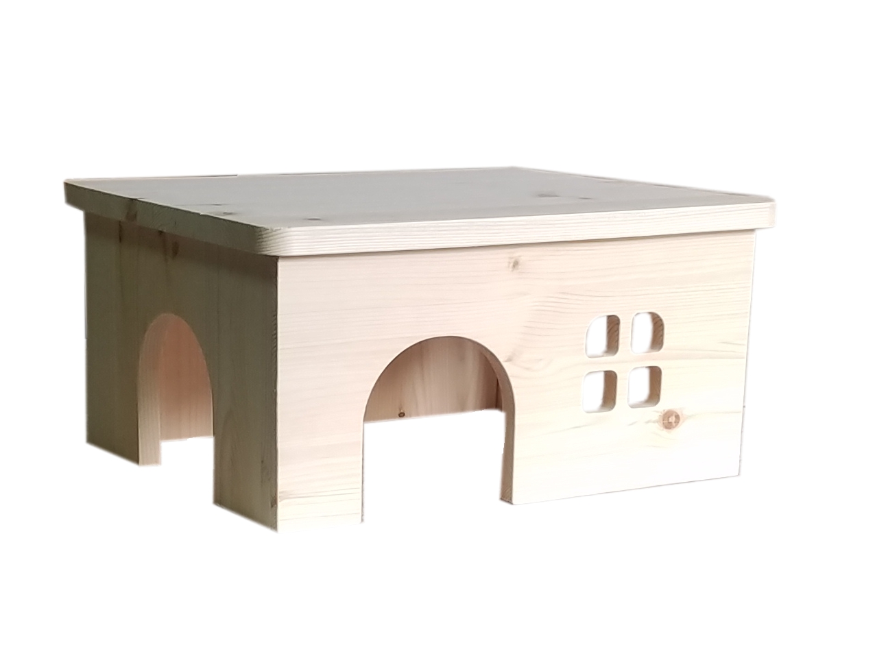 Geräumiges Häuschen für Meerschweinchen. Durch drei Eingänge gibt es genügend Fluchtmöglichkeiten, daher ist es auch für größere Schweinchengruppen geeignet. Aus naturbelassenem Nadelleimholz. Hergestellt in Deutschland.