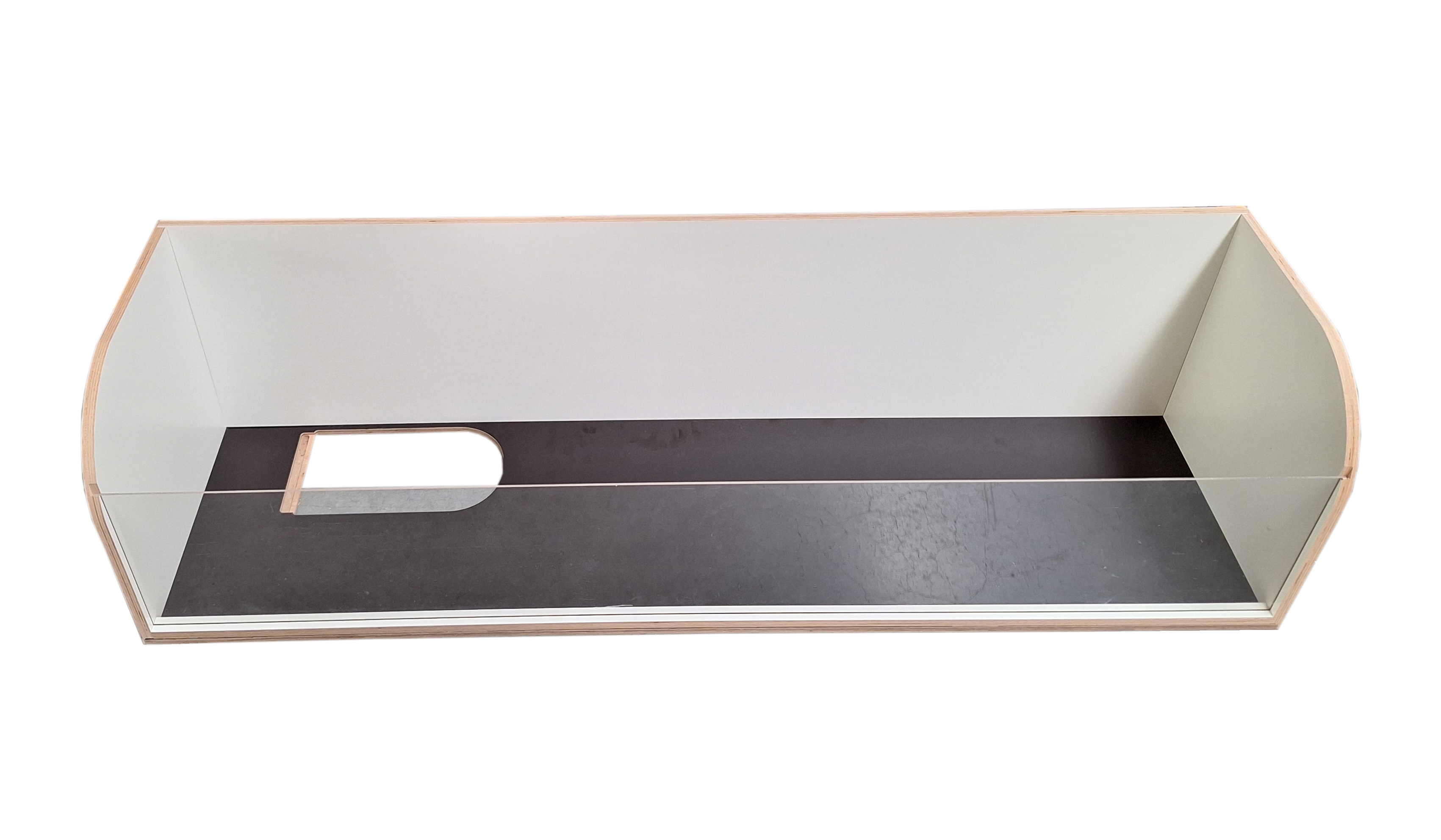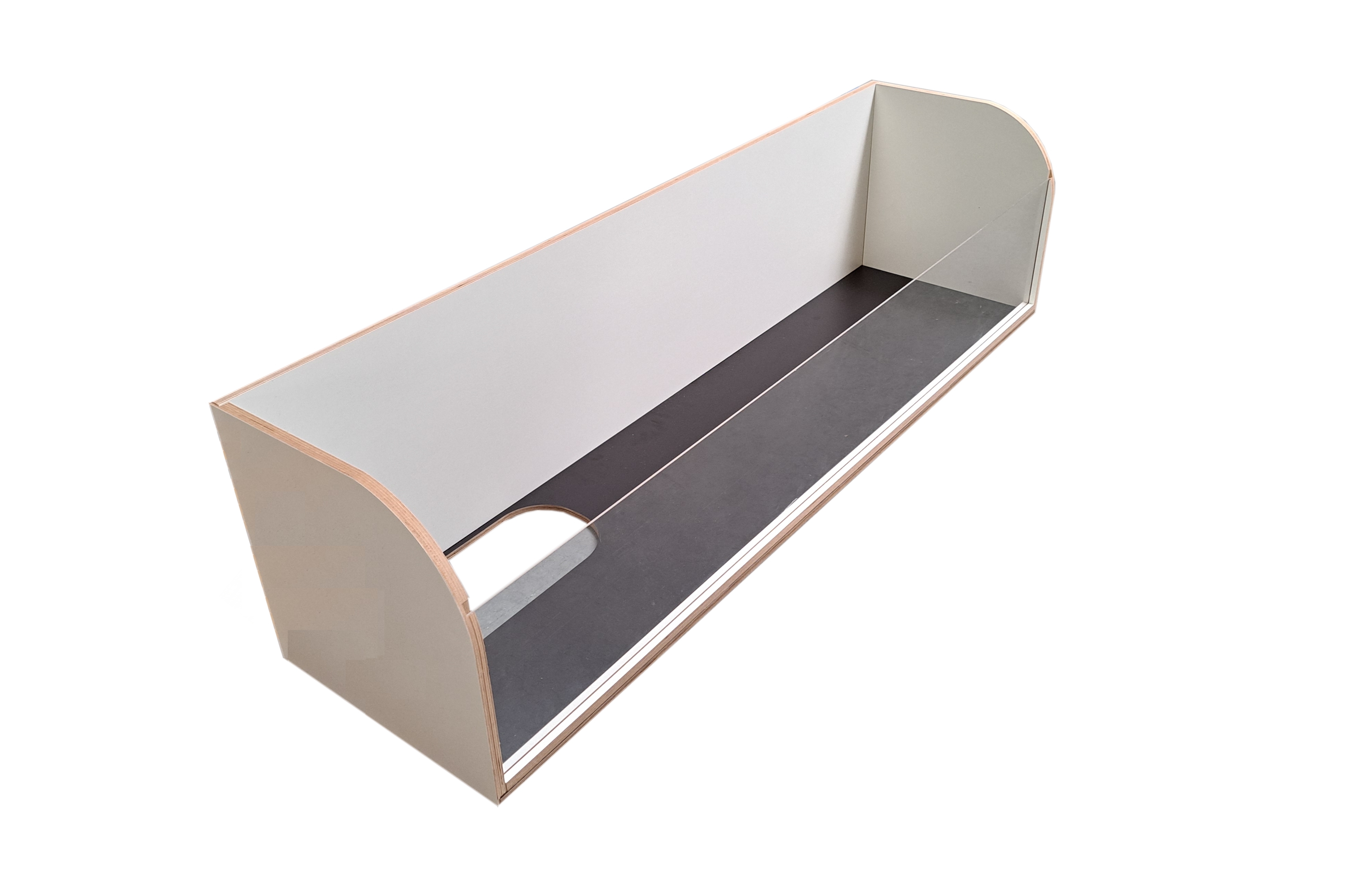Aus 15 mm wasserfest verleimtem Furniersperrholz mit weißer Melaminharzbeschichtung* oder mit schwarzer Phenolharzbeschichtung und 3 mm Acrylglas. Im Lieferumfang enthalten sind die benötigten Schrauben sowie eine mit Kork beschichtete Rampe. Gefertigt in Deutschland.